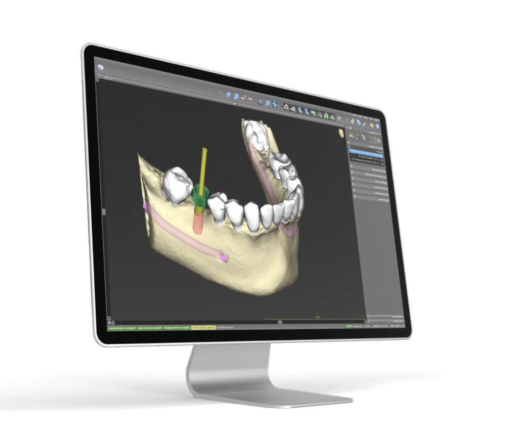 Si utilizzano radiografie 3D (come la CBCT) per ottenere una visione dettagliata della struttura ossea e dei tessuti molli del pazienti. Il modello digitale viene importato da software specializzati che generano un template chirurgico (una guida personalizzata), che viene utilizzata durante l’intervento per garantire che l’impianto venga inserito con precisione millimetrica, riducendo il rischio di complicazioni , quali danni a nervi e strutture vitali, e migliorando l’efficacia del trattamento.